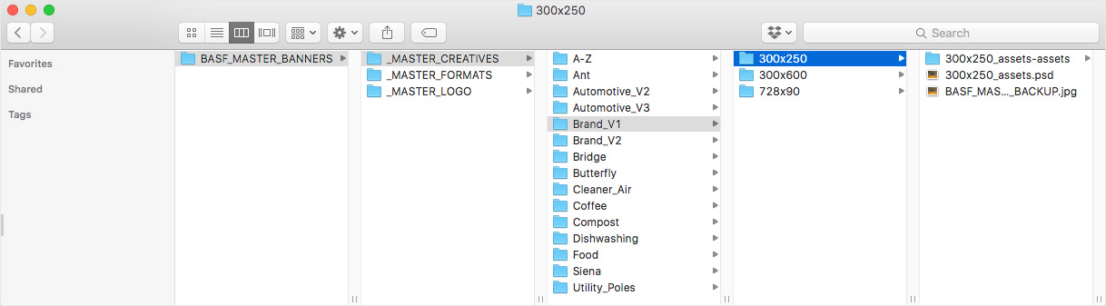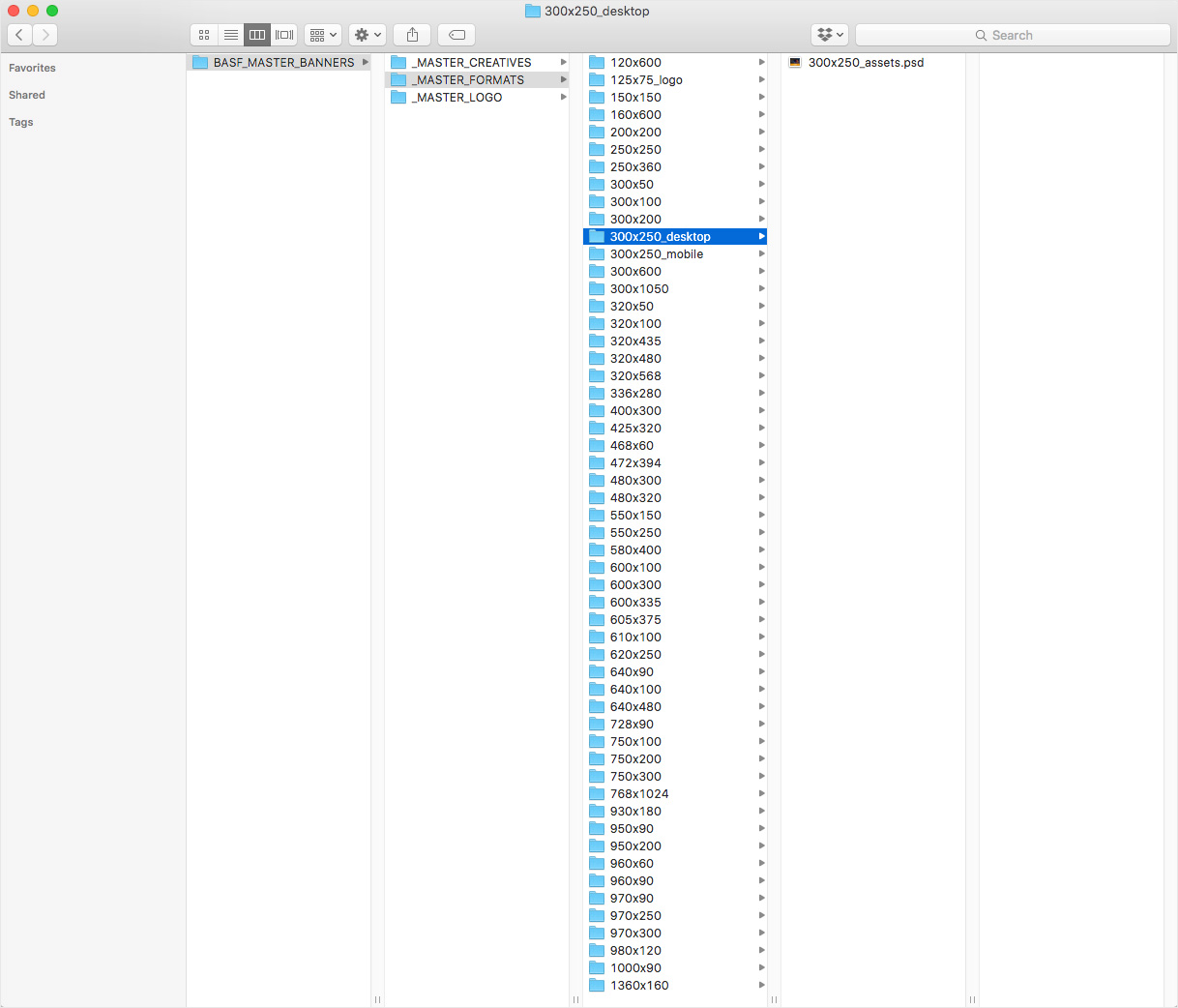 We then began the task of setting up two template libraries for the design team's use. The first of these was a '_MASTER_CREATIVES' library, and contained small sets of approved, 'master' PSDs (along with published build assets) for each proof points. Typically, these Master sets would include one square format (e.g. 300x250), one 'letterbox' format (e.g. 728x90) and one 'skyscraper' format (e.g. 160x600 or 300x600), the idea being that, if the creative concept worked in each of these distinctly different shapes, then it would likely work in any format that we encountered.