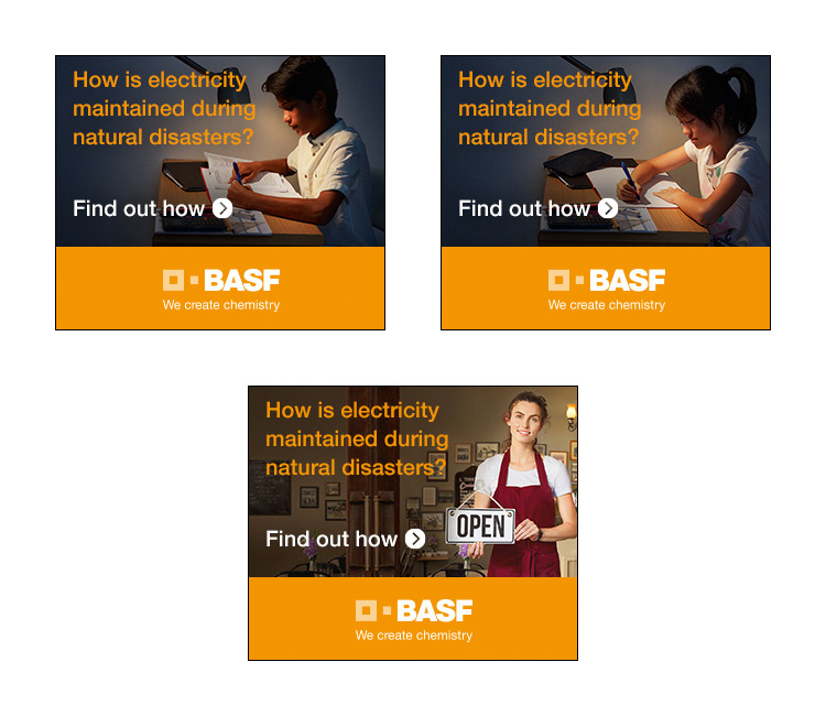 Alongside BASF's global website maintenance requirements, a significant part of this account involved the production of incredibly high volumes of display advertising communications material for multiple regions across Europe, Asia, the Americas, Africa and Australia. On a creative and technical level these ads were relatively straightforward (as most high-volume work tends to be) - the complexity of the task came from the ongoing organisation, management, art direction and QA of such vast quantities of production work, and from maximizing the speed, accuracy and efficiency of our working practices.